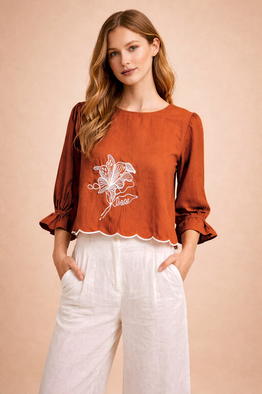 Thoughtfully crafted with a statement floral embroidery, this premium top reflects refined craftsmanship and modern elegance. The scalloped hemline adds a distinctive finish, while the soft Roman silk fabric ensures effortless comfort throughout the day. Designed to pair seamlessly with tailored trousers or denim, it is an elevated essential for contemporary wardrobes.